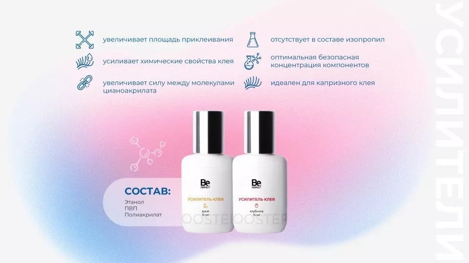 Основными модификаторами поверхности искусственной ресницы в усилителе клея являются полимер поливинилпирролидона и полиакрилат. Его использование улучшает адгезионную прочность и пластичность клеевого шва, что играет немаловажную роль, так как ресницы находятся в состоянии покоя.