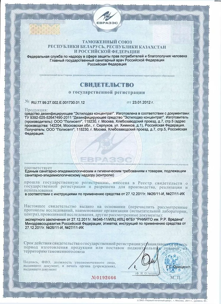 - комплекс четвертичных аммониевых соединений – суммарно 14±1,5%, полигексаметиленгуанидин гидрохлорид (ПГМГ) – 2,5±0,25%, а также вспомогательные компоненты (ПАВы, синергисты биоцидов, ингибитор коррозии и пр.). рН концентрата 6,0±1,0
