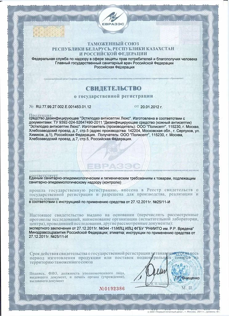 - спирт (2-пропанол) (48,0 ± 1,0%); н-пропиловый спирт (1-пропанол) (12,0 ± 1,0%); цетримоний хлорид (гексадецилтриметиламмоний хлорид - ЧАС) (0,25 ± 0,01%), увлажняющие и ухаживающие за кожей добавки