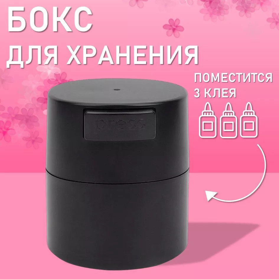 Элегантный черный цвет придает боксу стильный и профессиональный вид, который гармонично впишется в любое рабочее пространство. Благодаря компактным размерам контейнер легко размещается на туалетном столике или в косметичке, что делает его идеальным решением для хранения не только клеевых составов, но и других косметических средств.