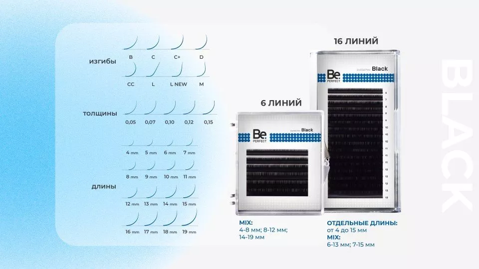 Be Perfect предлагает широкий выбор толщины и изгибов ресниц, что позволит каждому мастеру создать идеальный результат для каждого клиента, при этом современная технология помогает создать не только классическое, но и эффектное объемное наращивание.