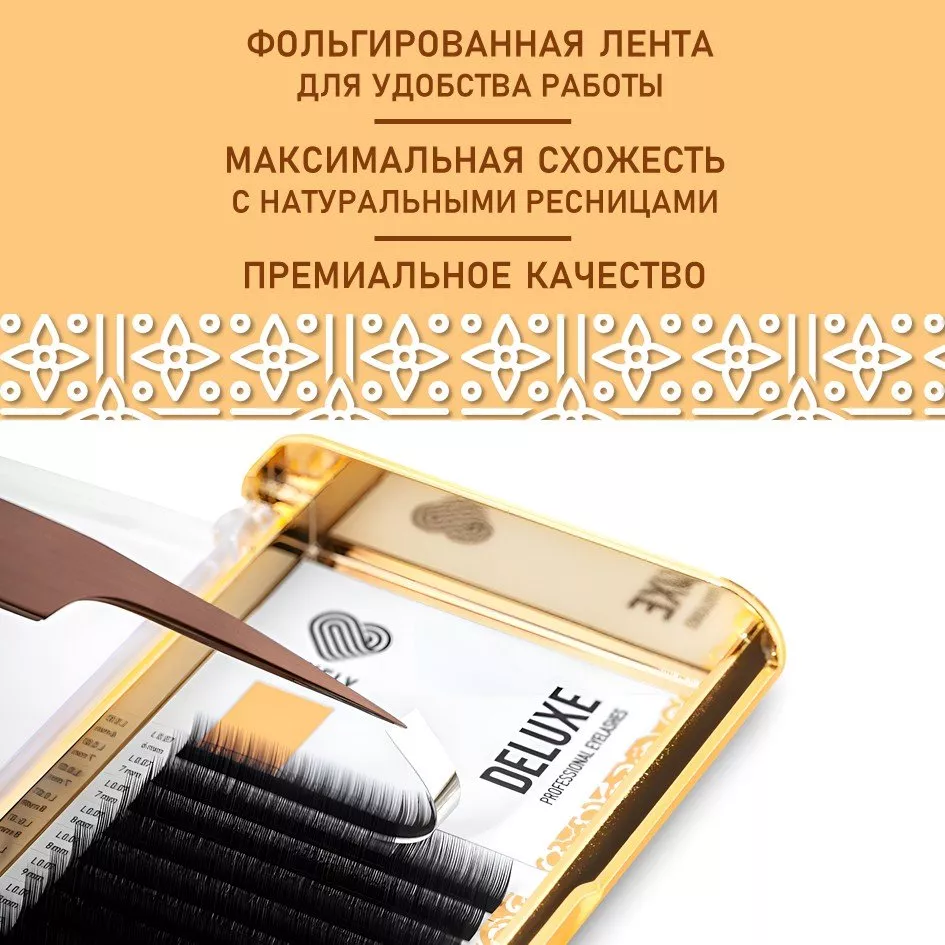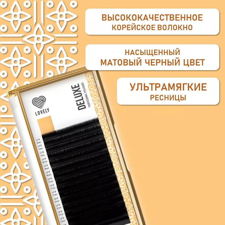 Чёрные ресницы Lovely серии «Deluxe» (16 линий, MIX) — профессиональный материал для наращивания, сочетающий удобство работы и выразительный результат. Палетка включает 16 линий с разнообразной длиной, толщиной и изгибом, что позволяет легко создавать индивидуальные эффекты и плавно миксовать параметры в одной работе. Ресницы отличаются насыщенным чёрным цветом и глянцевым блеском, обеспечивают естественный объём и чёткую форму. Средняя липкость ленты упрощает формирование пучков как в ленточной технике, так и при ручном методе — материал не прилипает к основанию и не оставляет клеевых следов.