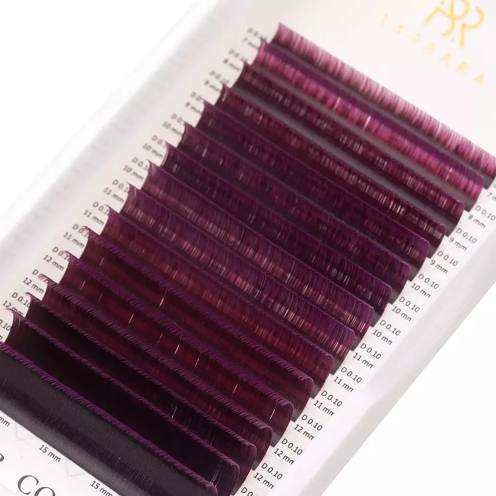 Ресницы омбре имеют основание черного цвета, которое плавно переходит в кончик фиолетового цвета. Подходят для любого типа наращивания и любой техники формирования пучков. Могут использоваться как начинающими мастерами, так и профессионалами высокого уровня.