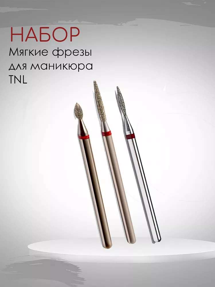 В наборе представлено 3 универсальных фрезы с красными насечками, которые должны быть в наборе у каждого мастера маникюра.