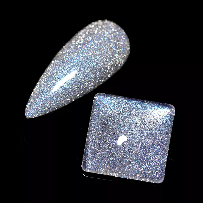 Оттенок: светоотражающий с серебряными, синими и голографическими блестками с эффектом Aurora, полупрозрачный