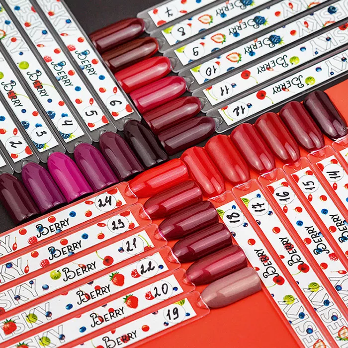 В палитру коллекции Berry входят 24 выразительных ягодных оттенка. Покрытия порадуют вас хорошей консистенцией, а стойкость данной линейки приятно удивит.