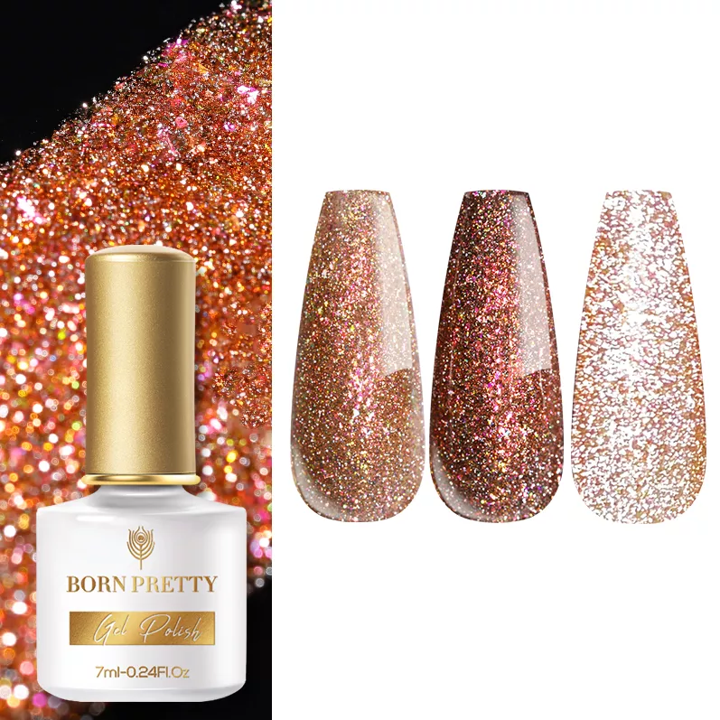 Оттенок: светоотражающий бронзово-золотой с зелено-желто-розовыми блестками-хлопьями, полупрозрачный