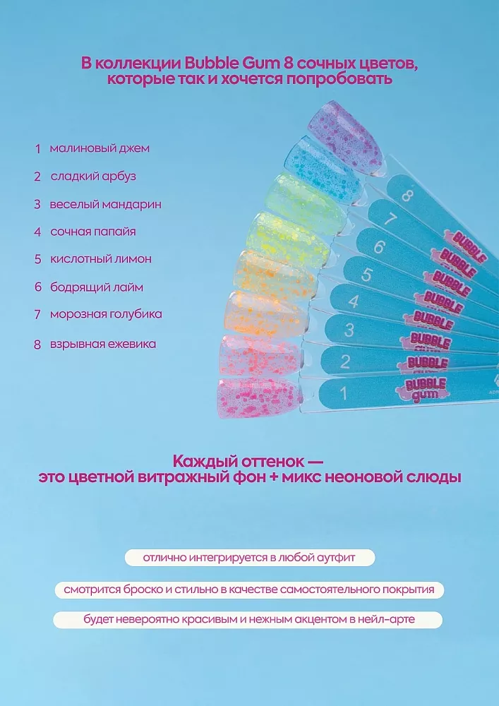 Коллекция состоит из 8 сочных цветов, которые смотрятся броско и стильно в качестве самостоятельного покрытия, а также могут стать нежным и красивым акцентом в нейл-арте. Каждый оттенок — это яркое сочетание цветного витражного фона и микса неоновой слюды. Гель-лак Bubble gum не требует нанесения базы, можно сразу наносить на ноготь; имеет среднюю консистенцию.