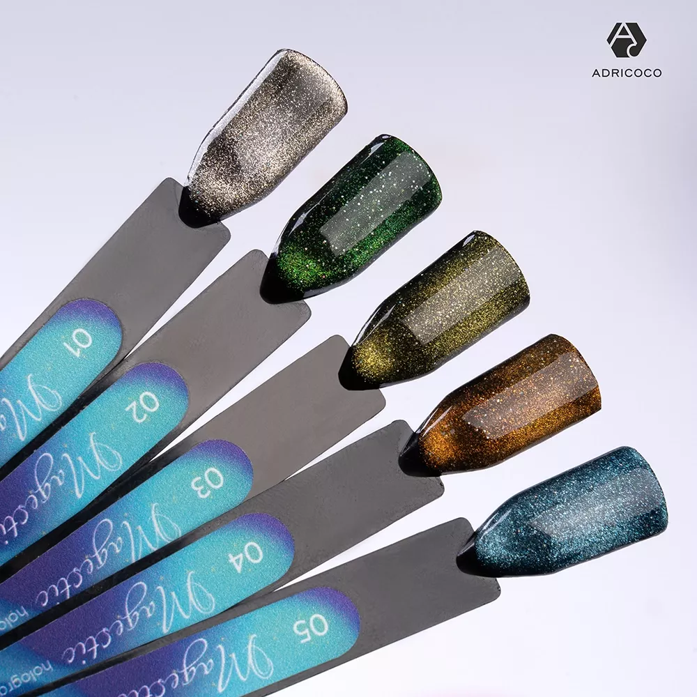 Гель-лак сочетает в себе чарующий эффект “кошачий глаз” с удивительным голографическим сиянием. Легкие металлические частицы быстро притягиваются к магниту и создают на поверхности ногтя бегающий блик, который переливается всевозможными цветами. Яркие цвета можно использовать как самостоятельно, так и на черной подложке.