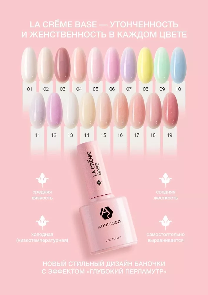 1. Подготовить ногтевую пластину. 2. Нанести La creme base в два слоя, каждый из которых полимеризовать в лампе. LED – 1 мин. / УФ – 2 мин. 3. Нанести закрепитель, просушить в лампе. LED – 1 мин. / УФ – 2 мин.