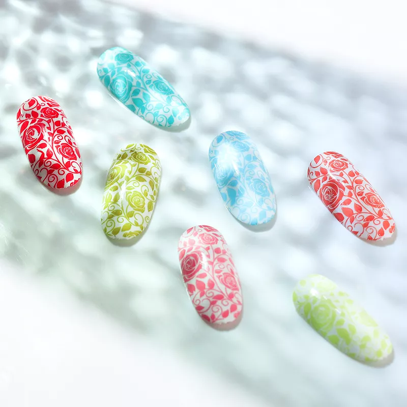Способ применения: нанести небольшое количество высокопигментированного лака для стемпинга на пластину с трафаретами, убрать излишки скребочком, придавить подушечку-штамп к рисунку и перенести его на ноготь. После перекрыть рисунок защитным верхним покрытием.