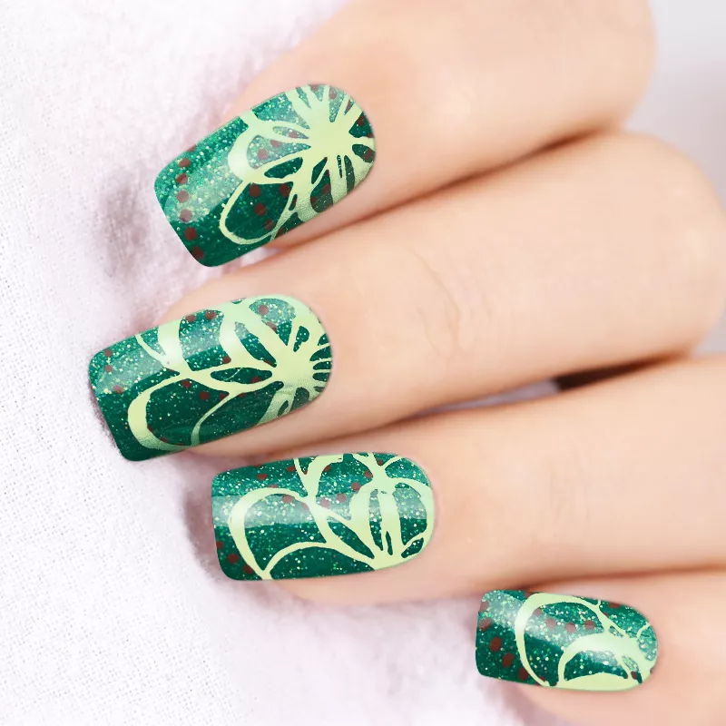 Способ применения: нанести небольшое количество высокопигментированного лака для стемпинга на пластину с трафаретами, убрать излишки скребочком, придавить подушечку-штамп к рисунку и перенести его на ноготь. После перекрыть рисунок защитным верхним покрытием.
