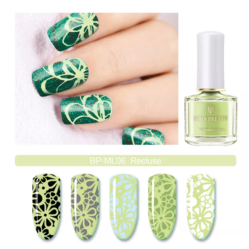 Лаки Born Pretty - качественные лаки для стемпинга, которые имеют высокую концентрацию пигмента в составе, благодаря чему смотрятся ярко и насыщенно. Обладают оптимальной консистенцией, легко ложатся на пластину или диск. Их преимущество - оптимальная скорость высыхания, не засыхают на штампе. Рисунок хорошо переносится на ноготок (даже самые мелкие детали остаются видны), имеет четкий контур и не смазывается после нанесения топового покрытия. Узоры особенно выигрышно смотрятся на ноготке, который покрыт контрастным цветом.