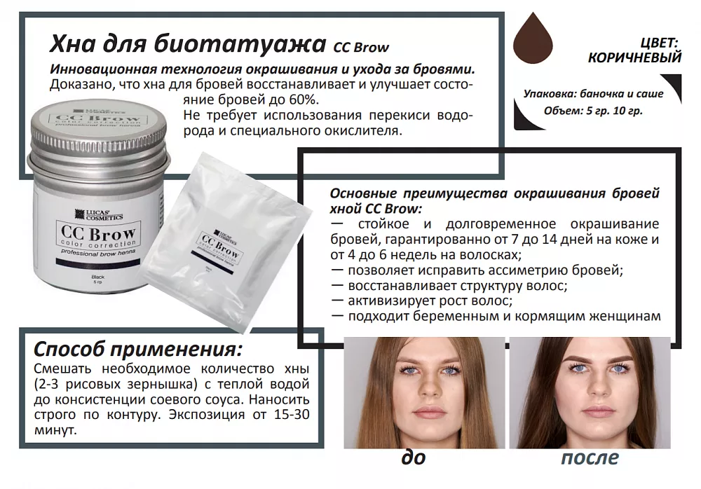 Инновационная технология ухода и окрашивания бровей хной с эффектом татуажа CC Brow. Такое окрашивание держится на коже 7-14 дней, на волосках хранится до 6 недель. Кроме того, доказано, что хна для бровей восстанавливает и улучшает состояние бровей до 60%. Не требует использования перекиси водорода и специального окислителя.