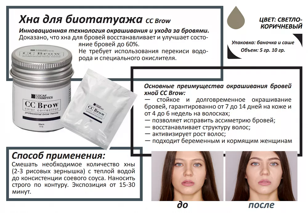 Инновационная технология ухода и окрашивания бровей хной с эффектом татуажа CC Brow. Такое окрашивание держится на коже 7-14 дней, на волосках хранится до 6 недель. Кроме того, доказано, что хна для бровей восстанавливает и улучшает состояние бровей до 60%. Не требует использования перекиси водорода и специального окислителя.