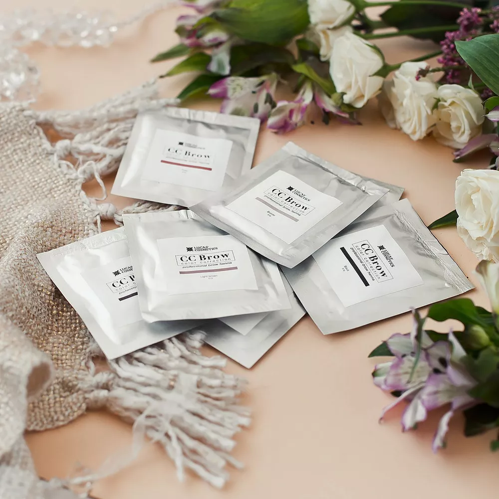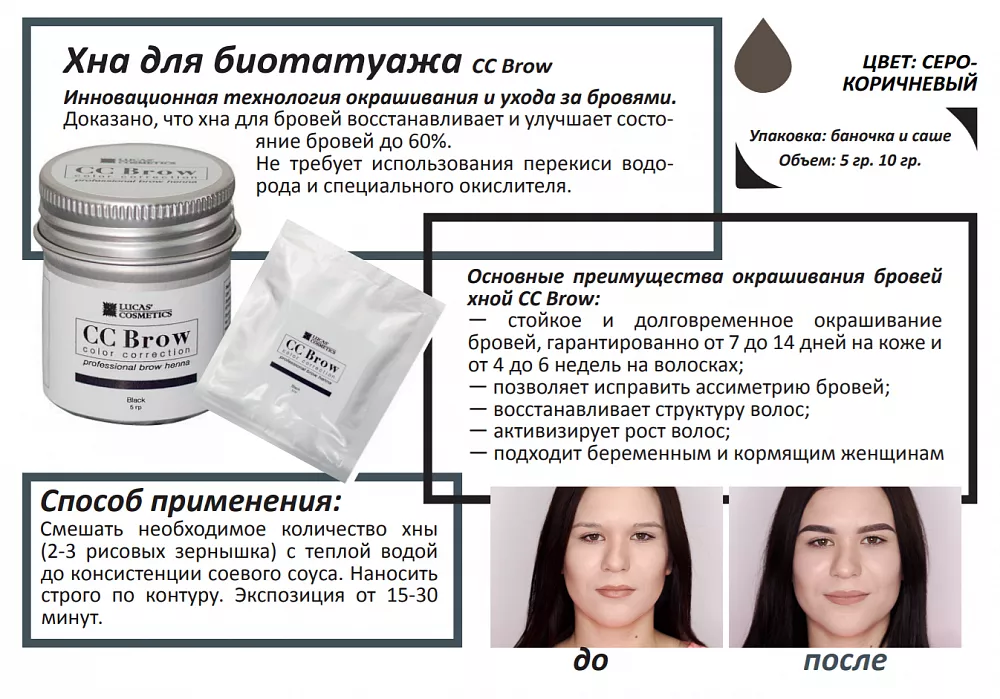 Инновационная технология ухода и окрашивания бровей хной с эффектом татуажа CC Brow. Такое окрашивание держится на коже 7-14 дней, на волосках хранится до 6 недель. Кроме того, доказано, что хна для бровей восстанавливает и улучшает состояние бровей до 60%. Не требует использования перекиси водорода и специального окислителя.