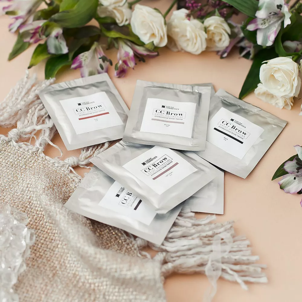 Инновационная технология ухода и окрашивания бровей хной с эффектом татуажа CC Brow. Такое окрашивание держится на коже 7-14 дней, на волосках хранится до 6 недель. Кроме того, доказано, что хна для бровей восстанавливает и улучшает состояние бровей до 60%. Не требует использования перекиси водорода и специального окислителя.