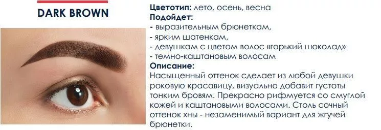 В результате окрашивания брови приобретают яркий, естественный цвет и максимально четкий контур, эффект татуажа держится на коже до двух недель, на волосках оттенок не теряет своей насыщенности в течение полутора месяцев.