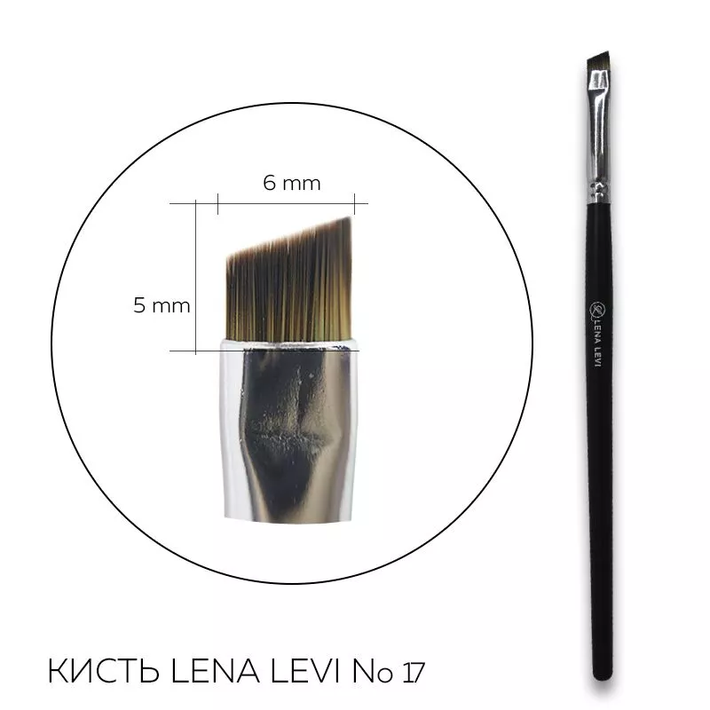 Скошенная плоская кисть Lena Levi No17, с плотным искусственным ворсом, идеально подойдет для работы как с кремовыми, так и пудровыми текстурами. Ровный плоский срез позволяет использовать кисть для прорисовки графичного контура или заполнения формы брови.