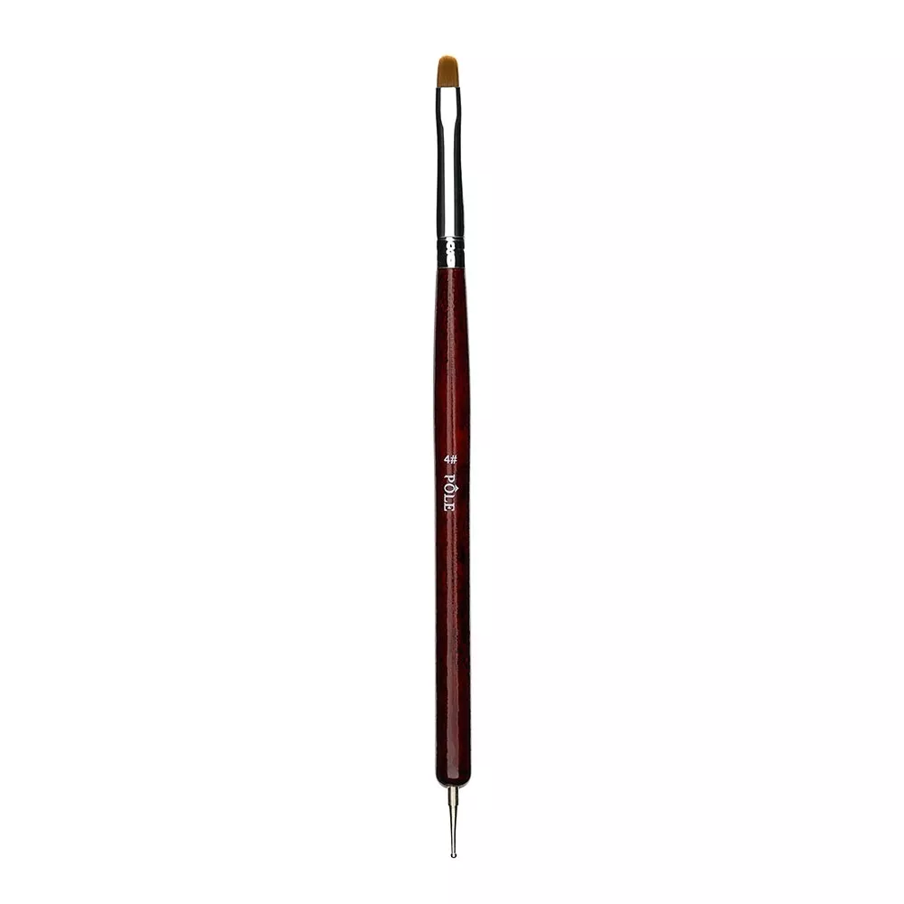 Кисть разработана специально для работы с гелем. Благодаря синтетическому ворсу материал равномерно распределяется по ногтевой пластине, а процесс нанесения становится более комфортным и быстрым. Эргономичная ручка имеет приятную удобную форму, идеально лежит в руке. На одном конце кисти находится металлический дотс, который позволяет создавать интересный дизайн. Инструмент помещен в индивидуальную упаковке в виде тубы.