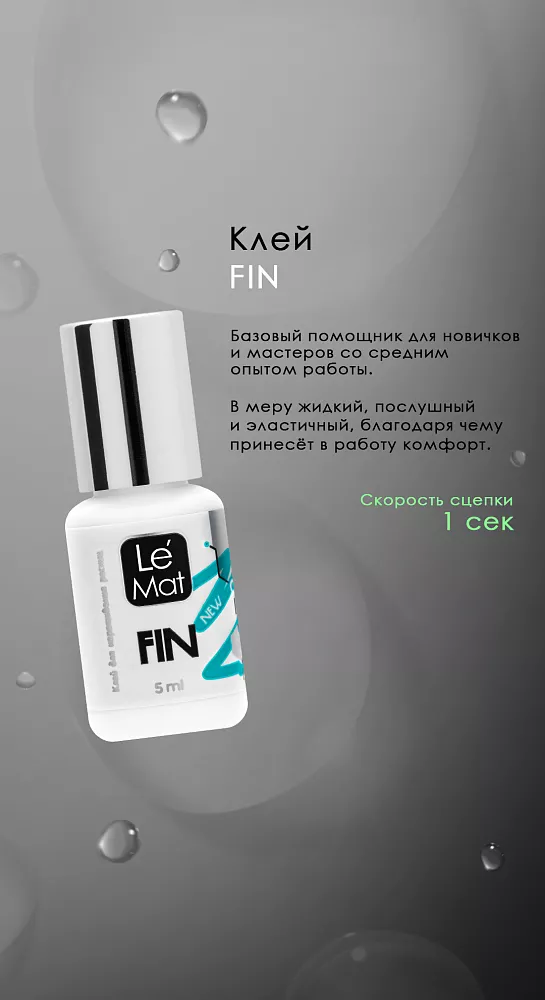 Органичный клей семейства Le Mat. FIN NEW станет базовым помощником для новичков и мастеров со средним опытом работы. В меру жидкий, послушный и эластичный, благодаря чему принесет в работу комфорт, а так же приятный результат - носку до 8 недель. Идеально держит пучок от 2д и более, как бы обволакивая ресницы. Имеет сниженные испарения.