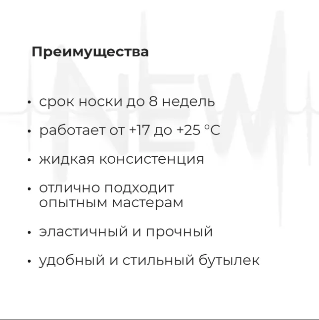Жидкая консистенция клея способствует моментальной сцепке, а количество испарений сведено к минимуму. Это снижает риск проявления аллергической реакции и делает работу с клеем более комфортной как для мастера, так и для клиента.