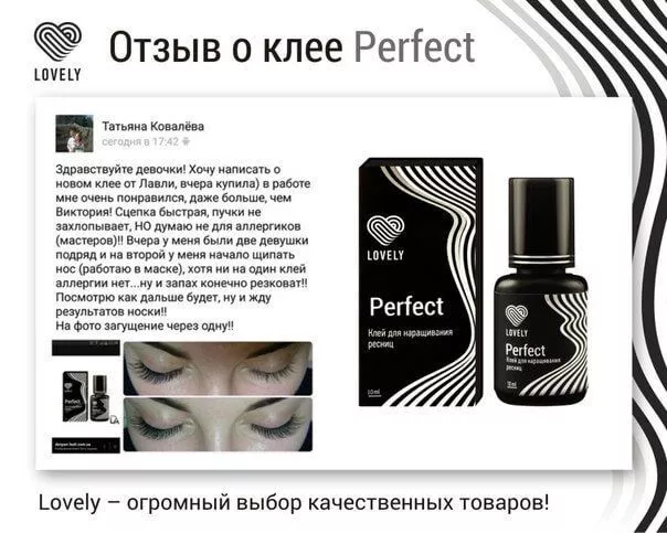 Клей Perfect – это композиция на основе органических и неорганических веществ, предназначенная для ультрабыстрой работы мастеров по наращиванию ресниц. Клей имеет жидкую консистенцию, устойчивую к возникновению вязкости при контакте с воздухом. Данный клей не утрачивает свои свойства при изменении температурного режима окружающей среды.