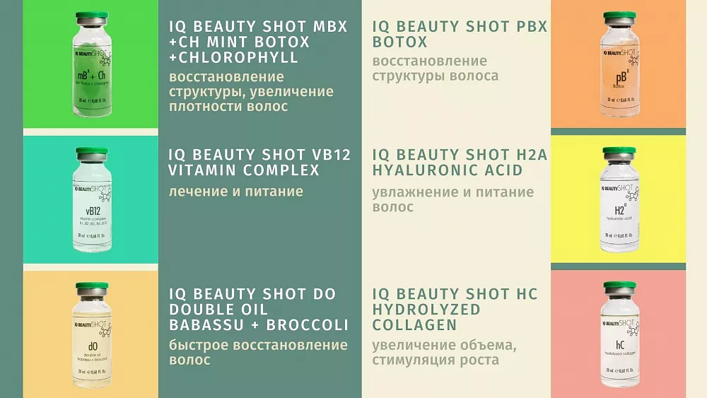 IQ Beauty Shot H2a hyaluronic acid – питает фолликулы, способствует улучшению циркуляции и обмену веществ в коже.