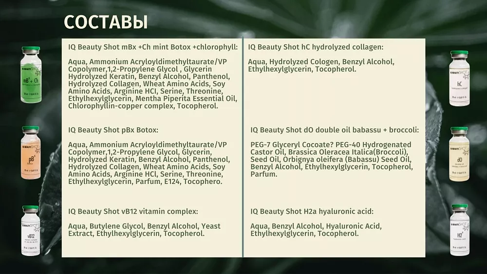 IQ Beauty Shot mBx + Ch mint LB + chlorophyll - в основной состав LB входит уникальный комплекс из 5 растительных аминокислот, которые составляют основу кератина. Хлорофилл, зеленый эликсир красоты или растительный "гемоглобин", придаёт волосам плотность, гладкость, эластичность и блеск.