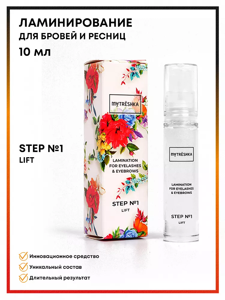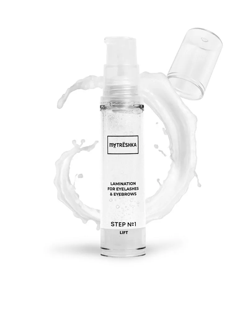Состав «Lift» Step 1- выполняет функцию лифтинга, качественно размягчает и приоткрывает чешуйки ресниц и бровей, бережно поднимает их от корней.