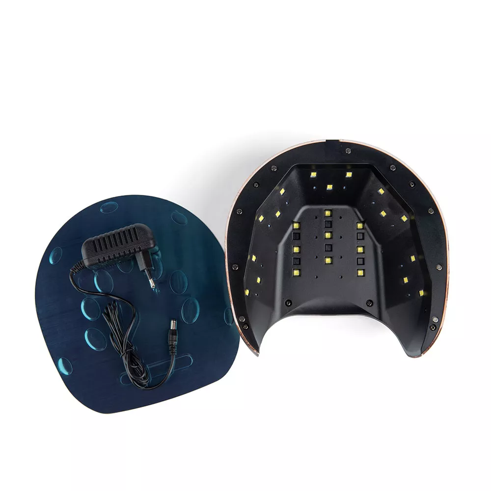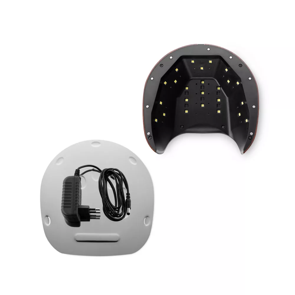 Технология двойного источника света равномерно просушивает поверхность ногтей. Съемное дно позволяет применять лампу в процедурах педикюра. Имеет специальные углубления для правильной постановки пальцев. Мощность 48 Вт подходит для полимеризации твердых гелей.