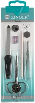 В набор входят: пилка алмазная F-5; палочка деревянная; ножницы маникюрные B-113;пинцет скошенный В-158. Цвет покрытия металла - матовое серебро.