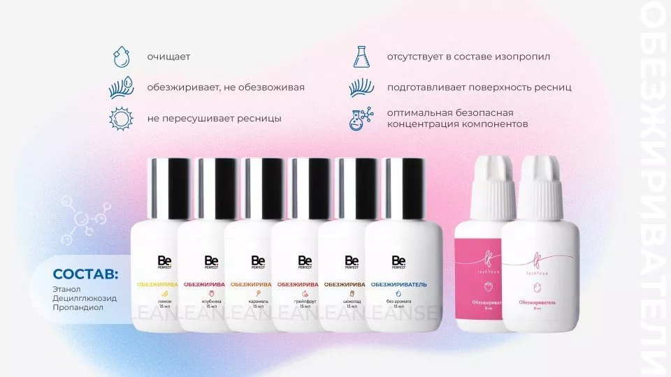 Обезжириватель препарат, используемый на этапе подготовки ресниц для обезжиривания поверхности, удаления остатков загрязнений (например, пыль, остатки косметических средств, естественные кожные выделения (пот, жир, солевые выделения)). Наносится на натуральные ресницы.