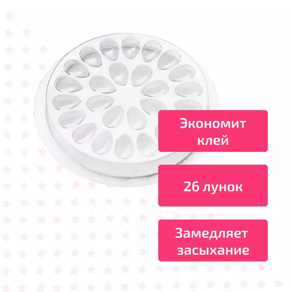 Палетка смешивания клея для наращивания ресниц. Палетка сделана на клейкой основе для надежной фиксации на столе или другой поверхности. Палетка для клея позволяет экономичнее расходовать клей: небольшие углубления -лунки уменьшают площадь испарения, капля клея медленнее высыхает и дольше сохраняет свои физические свойства. На палетке 26 лунок.
