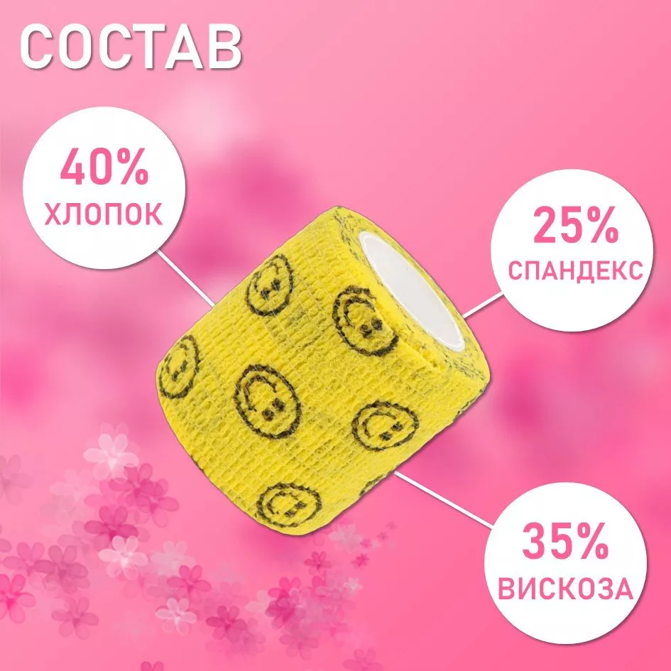Яркий дизайн с принтом смайла делает этот бинт не только функциональным, но и стильным аксессуаром для вашего рабочего процесса. Товар соответствует всем необходимым стандартам качества и обеспечивает комфорт как мастеру, так и клиенту.