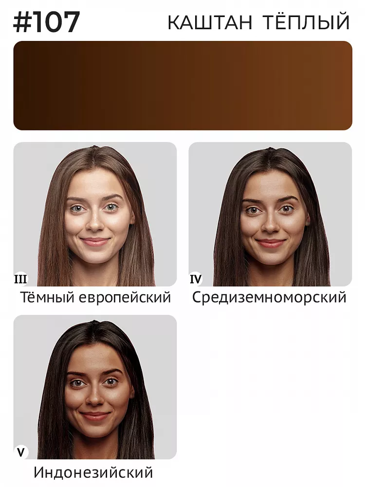 Кому подходит: тёмным, контрастным русым волосам, искусственным блондинкам с яркими бровями. Неярким, средней контрастности брюнеткам с нормальной и тонкой кожей.