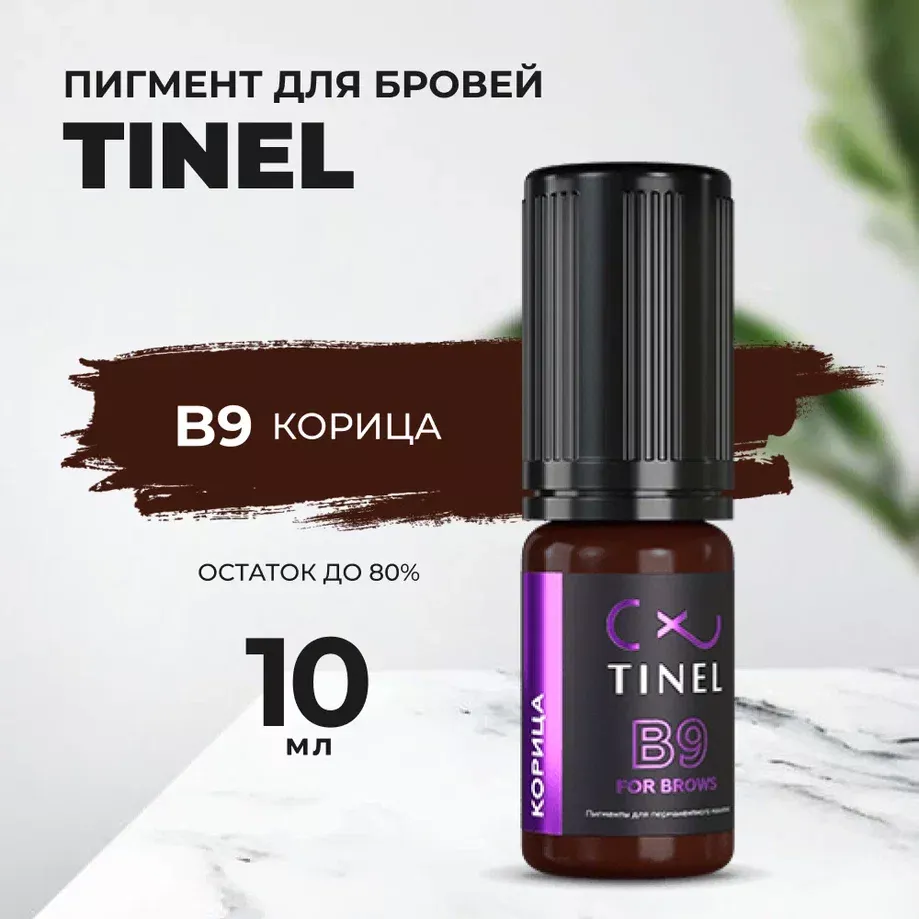 Гибридный состав (органика+неорганика). Самый популярный оттенок пигментов Тинель в серии B. Богатый тёмно-коричневый цвет для бровей. Жёлтая основа. На смуглой, толстой, жирной коже заживает тёмно-коричневым, иногда русо-коричневым оттенком. На тонкой, тёплой коже заживает золотисто-коричневым оттенком. За счёт техники нанесения можно сделать как полупрозрачный эффект, так и декоративно-визажный перманент.
