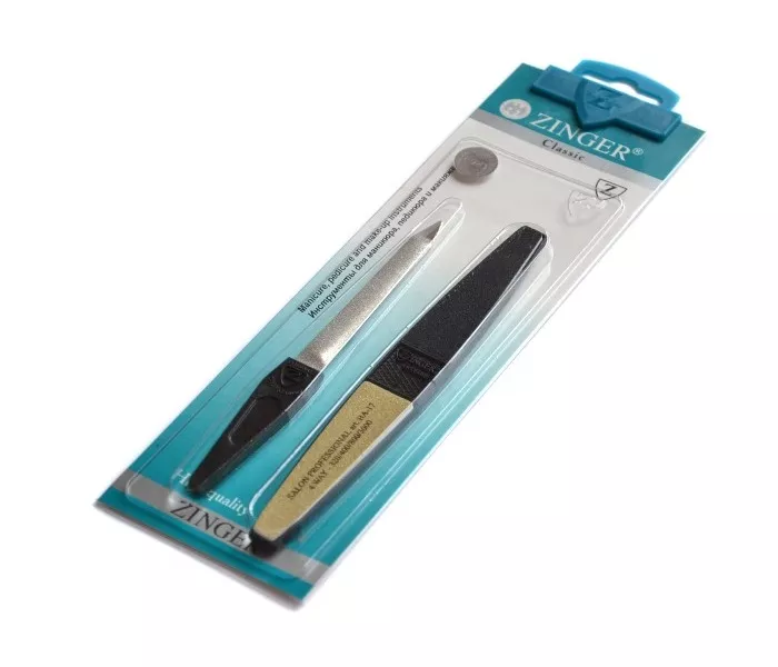 В данный набор входит металлическая пилка с алмазным напылением и четырехсторонний полировщик для ногтей, каждая из рабочих поверхностей которого имеет разную степень абразивности. Производитель набора - немецкая компания Zinger - мировой лидер в изготовлении инструментов для маникюра и педикюра. Алмазная пилочка в наборе предназначена для придания ногтям нужной формы, а полировщик используется для шлифовки и полировки ногтевой пластины.
