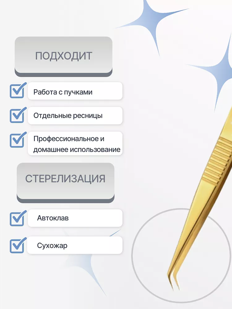 Выполнен из очень качественного, твердого, немагнитного металла. Благодаря форме в виде угловых кончиков он позволяет быстро и легко схватить несколько ресниц с ленты, даже самых тонких. Также применятся при наращивании бровей.