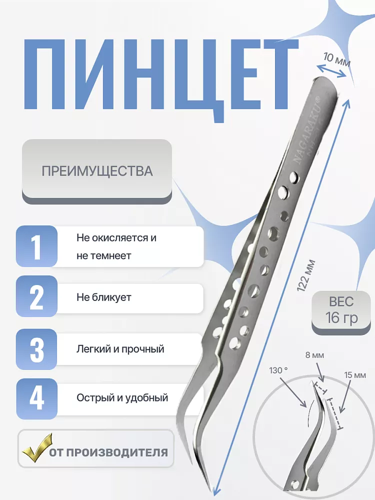 Высококачественный инструмент из нержавеющей стали, с антистатическим эффектом- незаменимый помощник при наращивании ресниц. Пинцеты отличные в работе, правильное смыкание, не требуют доп заточки. Подходит для классики и объёмов! Длина 122мм, длина изогнутой части = 40мм