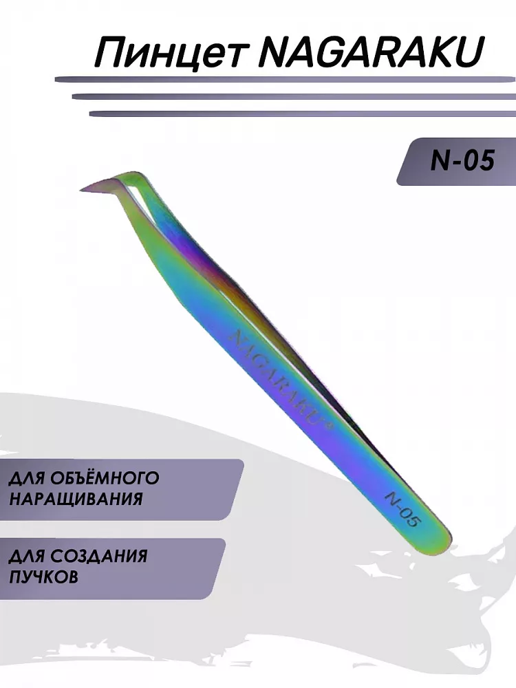 Профессиональный пинцет Nagaraku Volume N- 05 (cапожок). Пинцет изготовлен из высококачественной стали и обладает комфортным для длительной работы весом. Легко формирует пучки для мега объема и подходит под разные техники наращивания ресниц. Отлично ложится в руку, идеален для мастеров, которые любят чувствовать инструмент. Максимально плотное смыкание кончиков гарантирует захват даже самой маленькой ресницы и даже толщиной 0,05 мм. Жесткость пинцета — средняя, что позволяет работать без усилий, не напрягая руку. Площадь смыкания - 7 мм