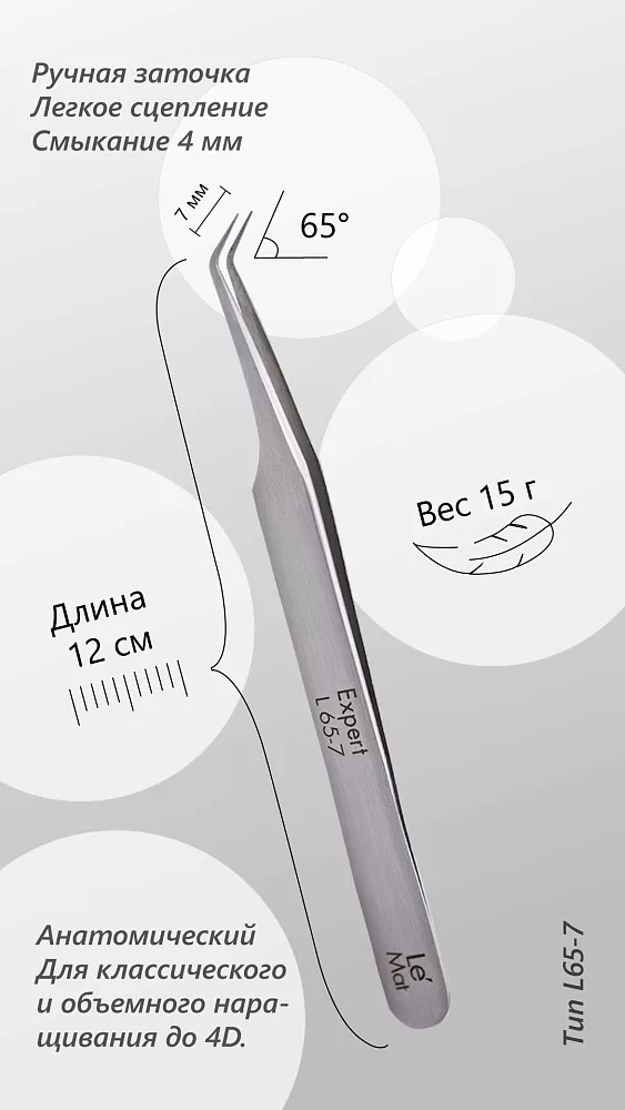 Пинцет анатомический, профессиональный, серии эксперт, тип L, 7 мм. Угол: 65° Длина створки: 7 мм Расстояние смыкания: 4 мм Длина пинцета: 120 мм Объемы: 2D-4D Серия Эксперт это баланс правильно подобранных под параметры женской руки характеристик инструмента, включающих: Вес, Длину, Смыкание. Данный баланс позволяет снизить нагрузку на кисть и предплечье, исключая риск перенапряжения, а так же сохраняя эмоциональное здоровье. Обозначение на пинцете его типа, угла и длины ножки, позволит точнее ориентироваться при выборе подходящего инструмента. Пинцеты Le Mat созданы создавать взгляд с легкой руки. У пинцетов из серии Expert мягкое смыкание, работа в одно касание, а пинцеты из серии Professionnel требуют легкого дожатия.