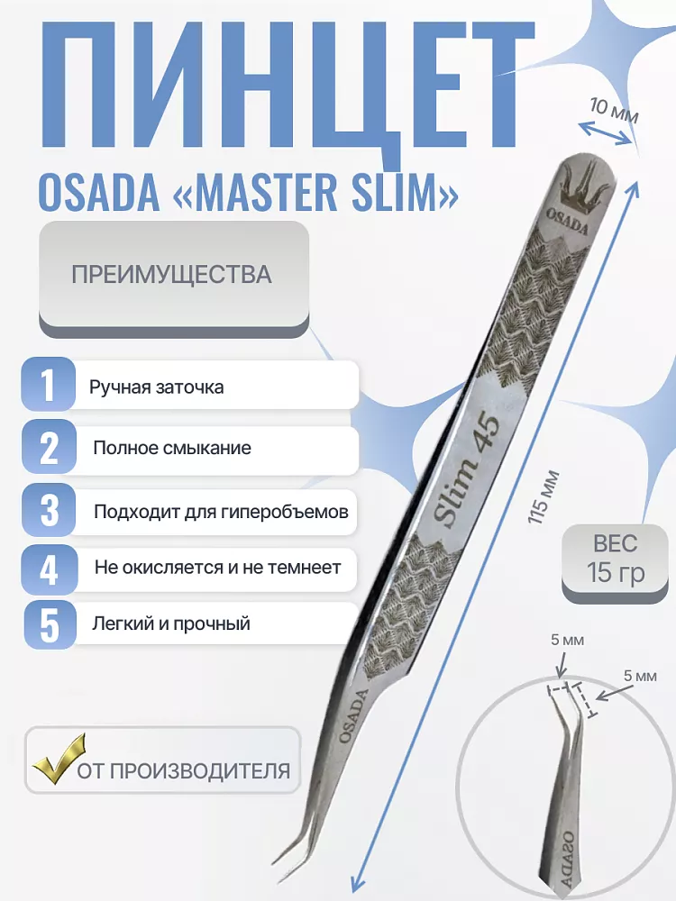 Пинцеты серии Slim обладают мягким ходом; расстояние между створками пинцета 4-7 мм, что позволит мастеру с комфортом работать целый день без ощущения усталости в руках. За счет специальной геометрии узора ручки инструмент четко сидит в руке и не выскальзывает.! Совет мастеру по наращиванию ресниц