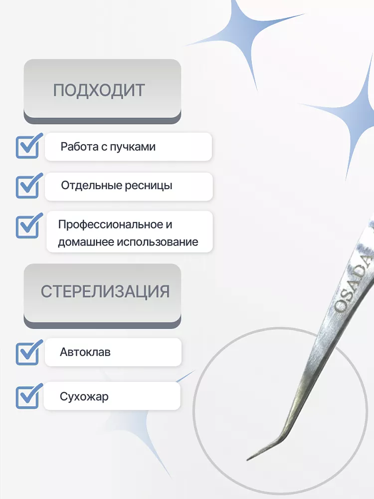 Для 2-4D объемов выбирайте стандартную длину носика- 4-7 мм, а если Вам нужен пинцет для гиперобъемов, то подойдет инструмент с длинными створками 8-10 мм.