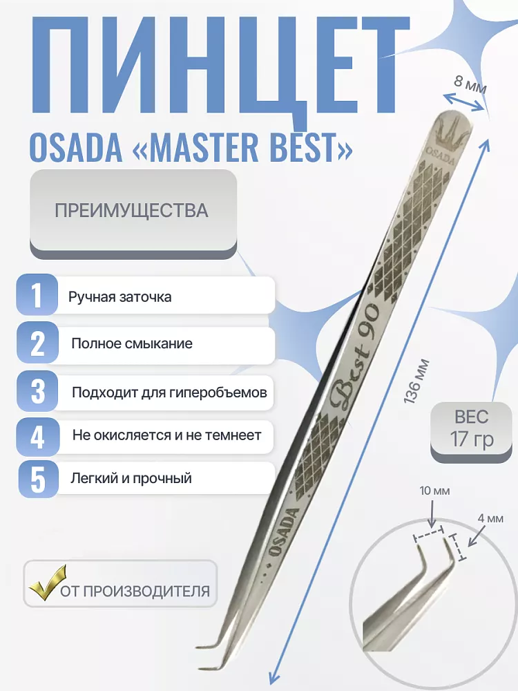«Master Best» - легкий пинцет с мягким смыканием створок. Идеален как для классики, так и для объёмного наращивания до 3D. У данного пинцета последовательное смыкание (смыкание с "дожатием"): сначала смыкается кончик, затем последовательно вся поверхность.