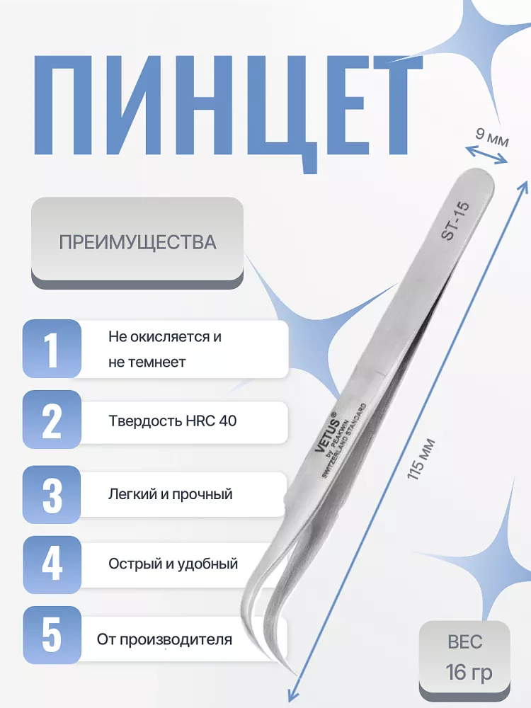 Особо тонкий наконечник. Пинцет изготовлен из нержавеющей стали.