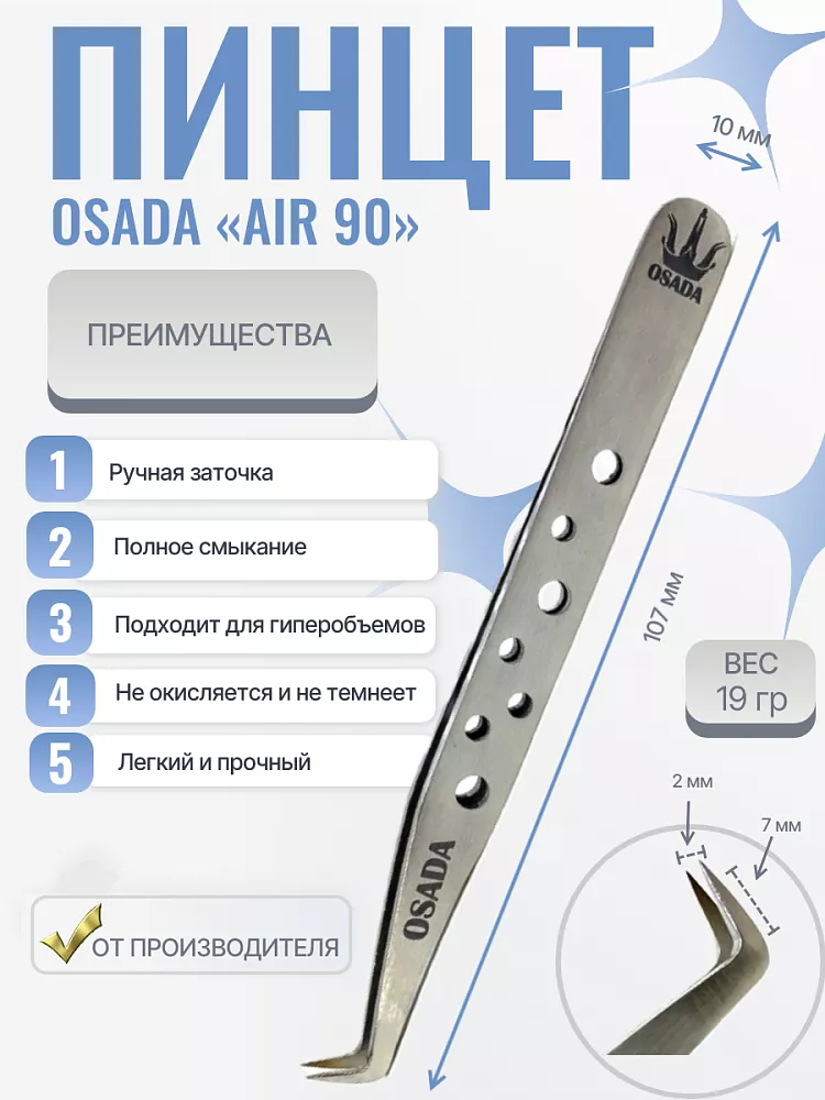 Пинцет OSADA Air 90 — незаменимый инструмент для наращивания ресниц. Он создан специально для быстрого формирования пучков и обеспечивает высокую точность работы.