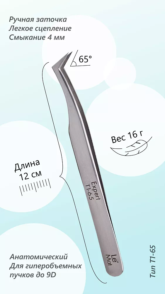 Пинцет анатомический, профессиональный, серии эксперт, тип T. Угол: 65° Расстояние смыкания: 4 мм Длина пинцета: 120 мм Объемы: 2D-9D Серия Эксперт это баланс правильно подобранных под параметры женской руки характеристик инструмента, включающих: Вес, Длину, Смыкание. Данный баланс позволяет снизить нагрузку на кисть и предплечье, исключая риск перенапряжения, а так же сохраняя эмоциональное здоровье. Обозначение на пинцете его типа, угла и длины ножки, позволит точнее ориентироваться при выборе подходящего инструмента. Пинцеты Le Mat созданы создавать взгляд с легкой руки. У пинцетов из серии Expert мягкое смыкание, работа в одно касание, а пинцеты из серии Professionnel требуют легкого дожатия.