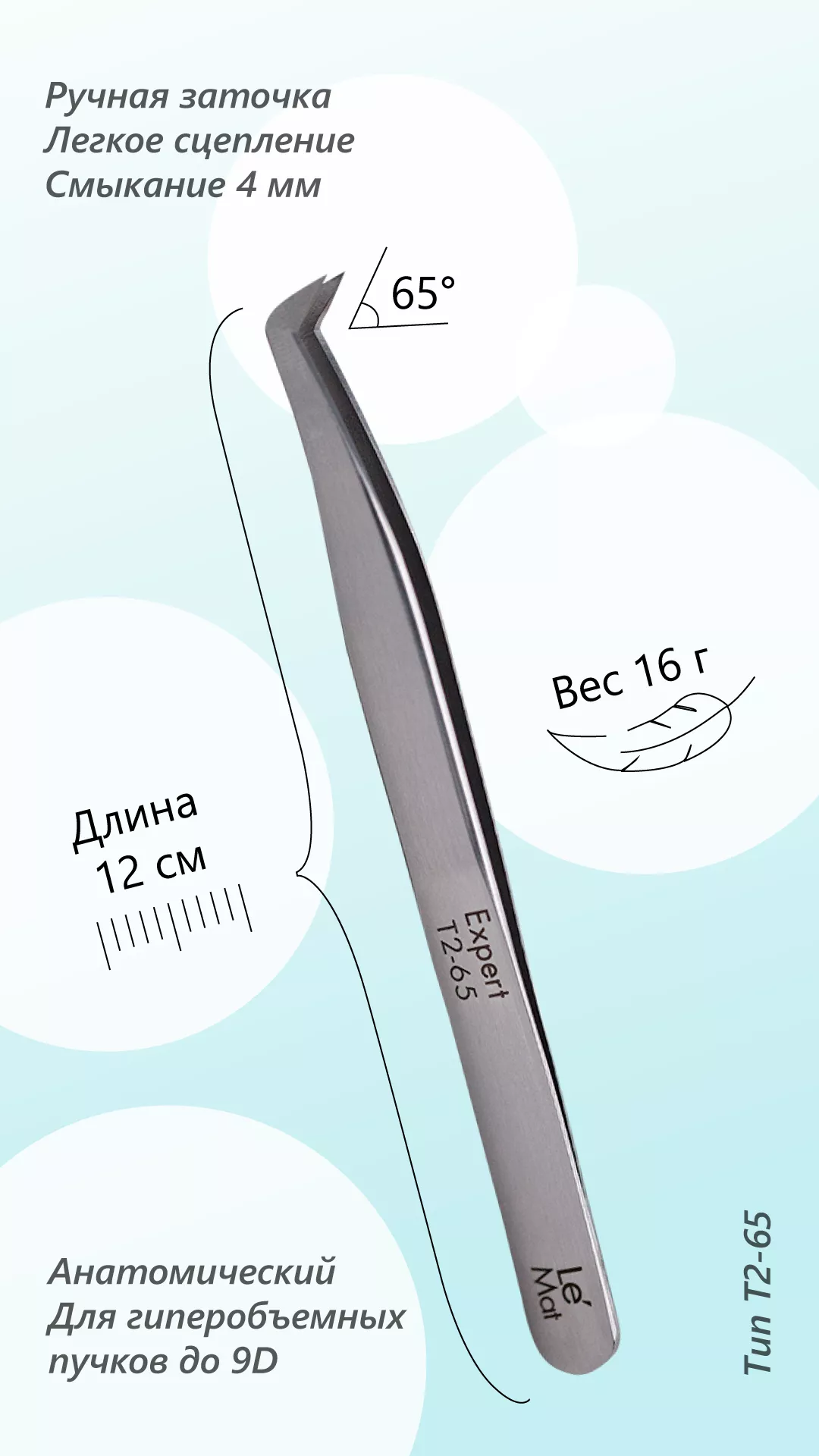 Пинцет анатомический, профессиональный, серии эксперт, тип T. Угол: 65° Расстояние смыкания: 4 мм Длина пинцета: 120 мм Объемы: 2D-9D Серия Эксперт это баланс правильно подобранных под параметры женской руки характеристик инструмента, включающих: Вес, Длину, Смыкание. Данный баланс позволяет снизить нагрузку на кисть и предплечье, исключая риск перенапряжения, а так же сохраняя эмоциональное здоровье. Обозначение на пинцете его типа, угла и длины ножки, позволит точнее ориентироваться при выборе подходящего инструмента. Пинцеты Le Mat созданы создавать взгляд с легкой руки. У пинцетов из серии Expert мягкое смыкание, работа в одно касание, а пинцеты из серии Professionnel требуют легкого дожатия.