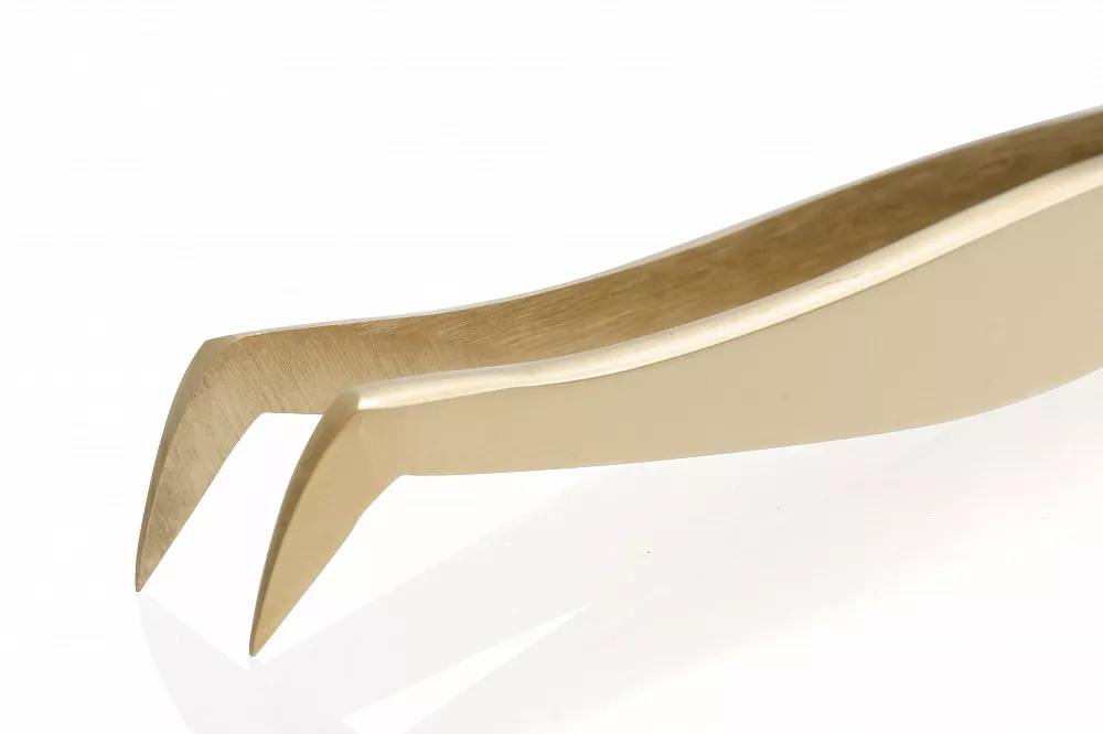 Благодаря загнутой форме кончиков пинцета, имеющих идеальное схождение по всей длине, облегчается и ускоряется процесс захвата одновременно нескольких ресниц для объёмного наращивания ресниц.